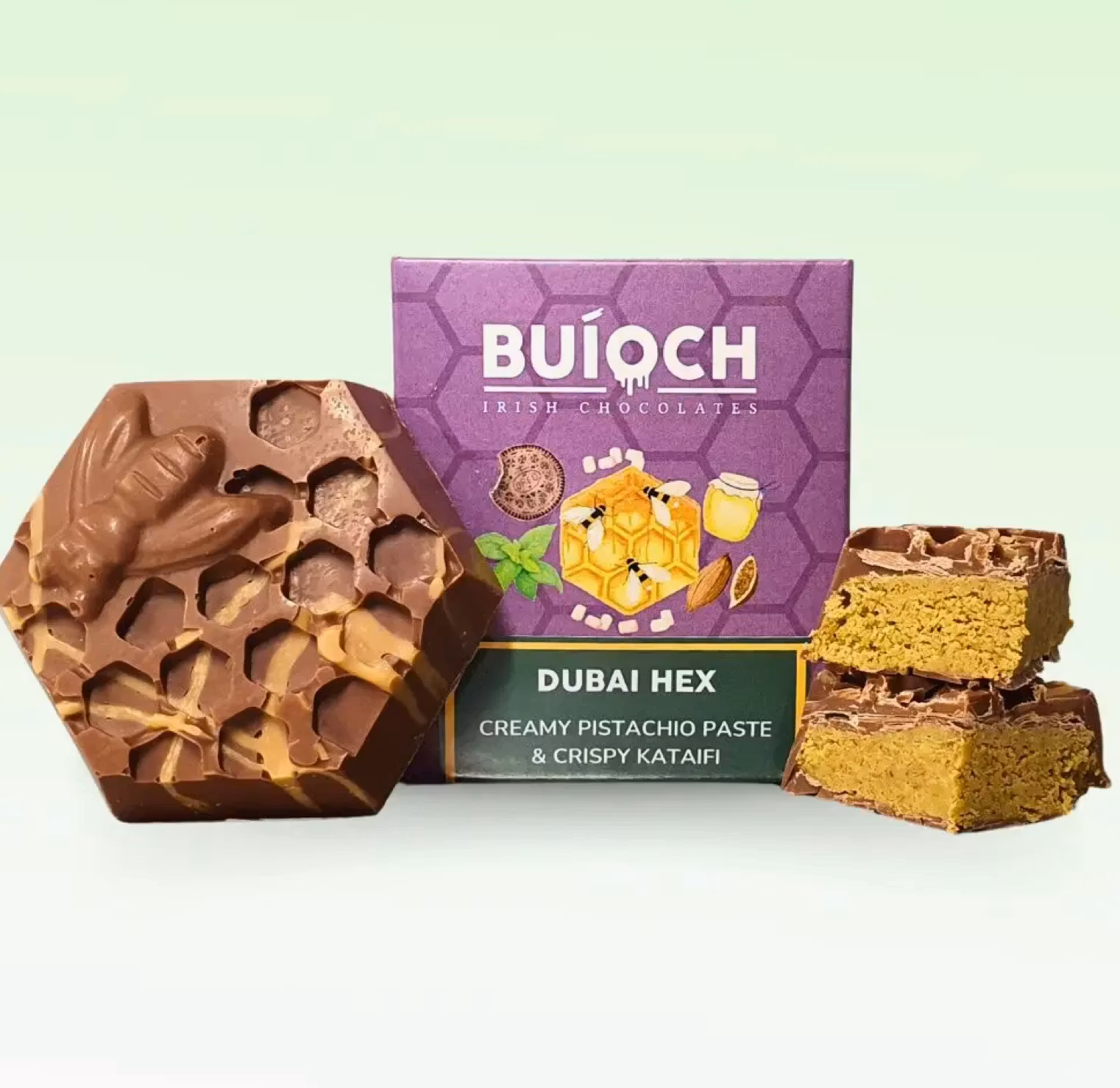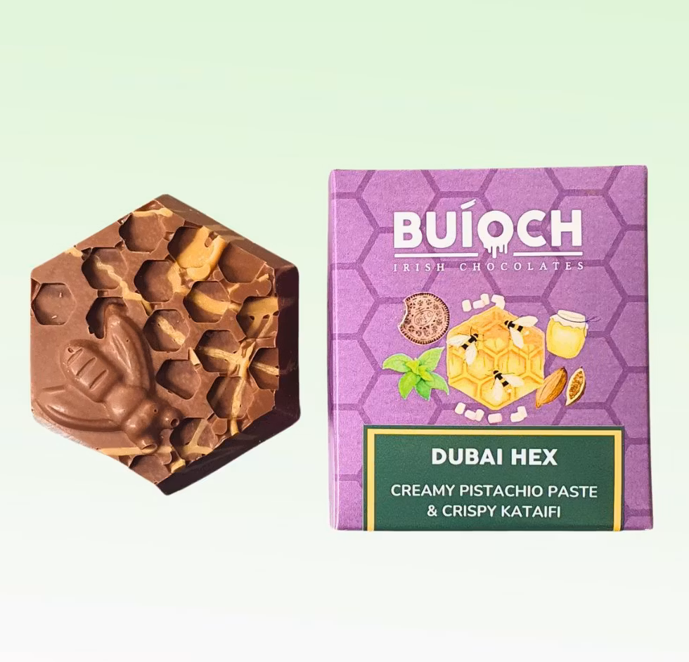 Introducing The Dubai Hex, a bold, indulgent 80g chunk of chocolate, expertly crafted in Buíoch’s signature hex mould. Beneath its smooth, glossy shell lies a thick, decadent filling of Buíoch’s signature pistachio kataifi mix, blending creamy richness with irresistible crunch. Designed for those who crave unapologetic luxury in every bite.